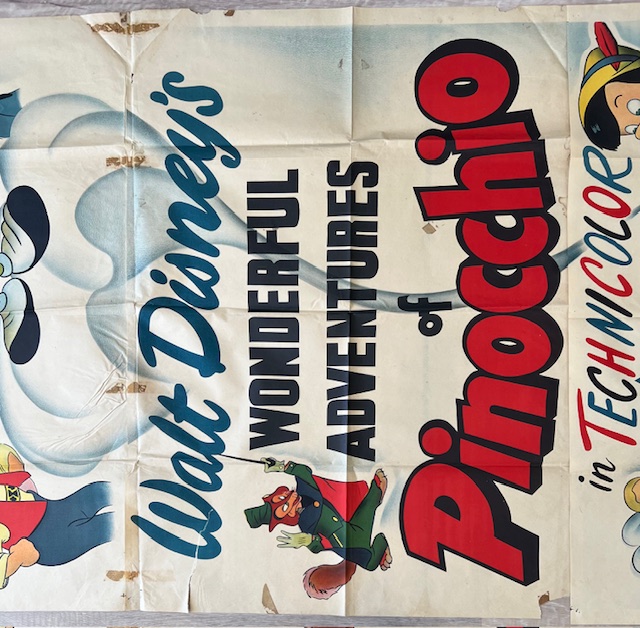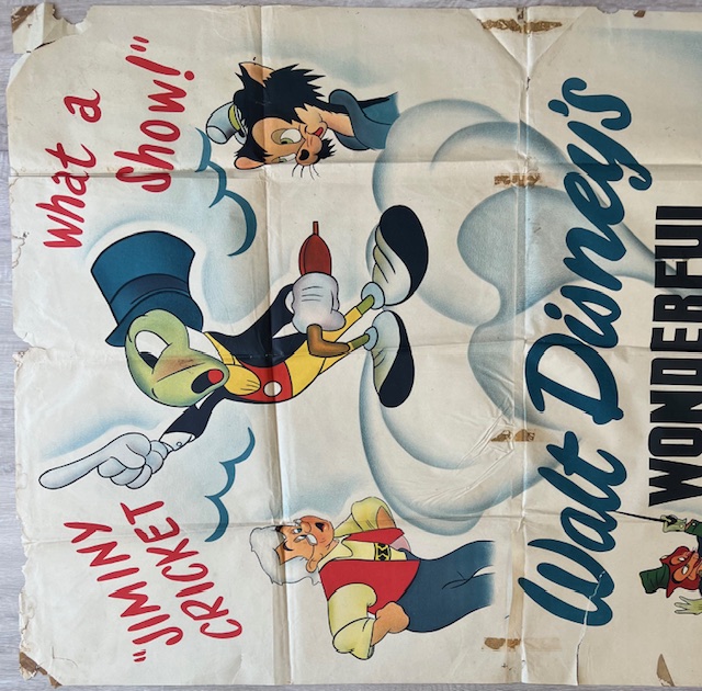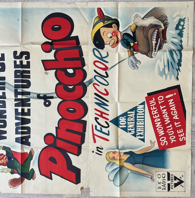 Pinocchio Poster Three Sheet Rare Australian Original 1945 re-issue.Note that this poster is undated, but it certainly is from 1945 (or soon after), because the movie has been retitled to "Walt Disney's Wonderful Adventures of Pinocchio", and that was done in the U.S. for its 1945 re-release. Note that this poster has full-bleed borders on the left and right and has NOT been trimmed. It is in Good condition and the key art presents nicely. With professional Linen Backing it will restore well.