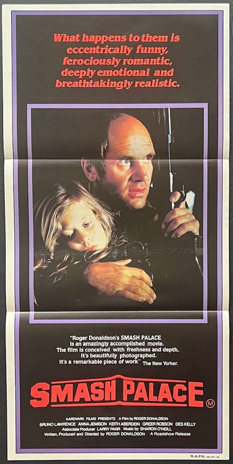 Smash Palace Poster Rare Daybill.Smash Palace is a New Zealand feature film, released in April 1982. The film chronicles a former race car driver (played by Bruno Lawrence) who inadvertently helps ruin his own marriage, then kidnaps his daughter (Greer Robson). Lawrence's character runs a car wrecking yard in an isolated area of New Zealand's North Island. Smash Palace was the second feature directed by Australian Roger Donaldson .Critical acclaim in the United States won him interest from Hollywood, and the chance to direct the first of a number of films financed outside of New Zealand ie. The Bounty, No Way Out, Thirteen Days, Dante’s Peak etc. The film won much acclaim for the performance of Bruno Lawrence, one of New Zealand's best-known actors. It was successful in its home land, and received positive reviews in the United States; Veteran critic Pauline Kael described it as "amazingly accomplished". Roger Ebert called it one of the best films of 1981, The New York Times picked it as one of its ten best movies of the year. The soundtrack was composed and performed by New Zealand-born singer Sharon O'Neill.