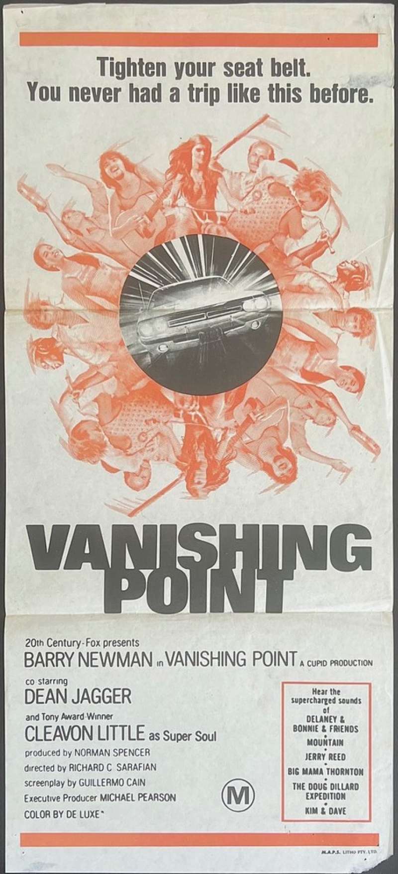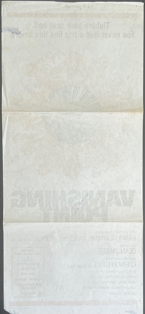 Vanishing Point Poster Daybill exceptionally rare original 1970s Re-Issue.Vanishing Point is a 1971 American action film directed by Richard C. Sarafian, starring Barry Newman, Cleavon Little, and Dean Jagger.It focuses on a disaffected ex-policeman and race car driver delivering a muscle car cross-country to California while high on speed ("uppers" in the story), being chased by police, and meeting various characters along the way. In 1969, director Richard C. Sarafian turned down an offer to make Robert Redford's Downhill Racer in order to direct Vanishing Point. He was drawn to the counterculture themes in Cain's script.Originally, the director wanted Gene Hackman to play Kowalski, but 20th Century Fox studio executive Richard Zanuck insisted on casting relative unknown actor Barry Newman in the lead role.Carey Loftin was the film's stunt coordinator and responsible for setting up and performing the major driving stunts.Loftin's resume at the time included work on Grand Prix (1966), Bullitt (1968), and The French Connection (1971).Since the films release it has developed a major cult following.