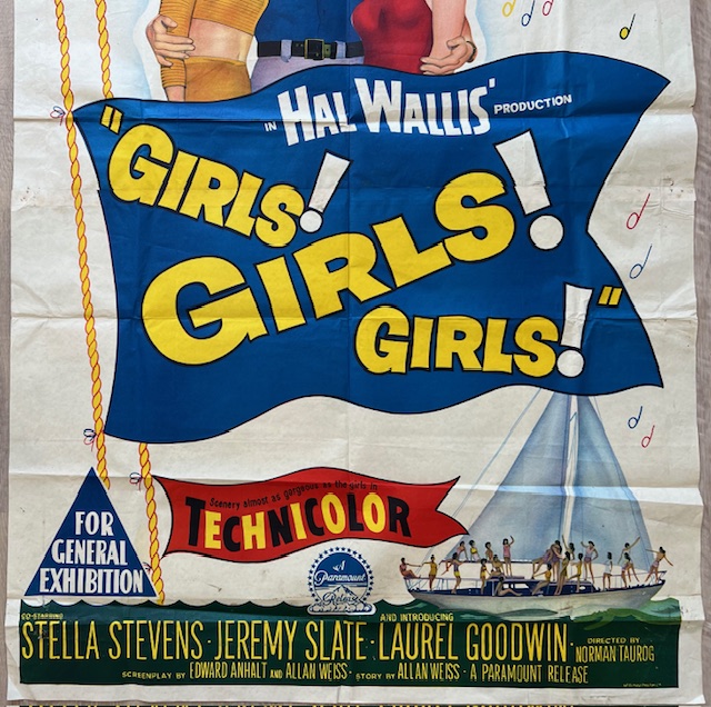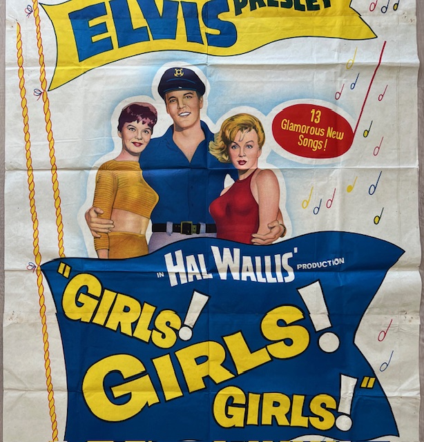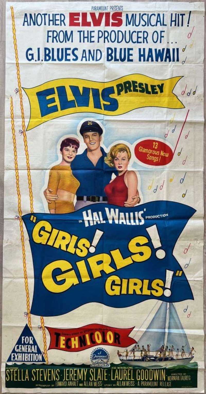 Girls Girls Girls Poster Three Sheet Original 1962 RARE Elvis Presley.Girls! Girls! Girls! is a 1962 American musical comedy film starring Elvis Presley as a penniless Hawaii-based fisherman who loves his life on the sea and dreams of owning his own boat. "Return to Sender", which reached No. 2 on the Billboard pop singles chart, is featured in the film. The film peaked at #6 on the Variety box office chart.It was also nominated for the Golden Globe award for Best Motion Picture - Musical in 1963. Elvis Presley received a 2nd place Laurel Award for the best male performance in a musical for his acting role in this movie.